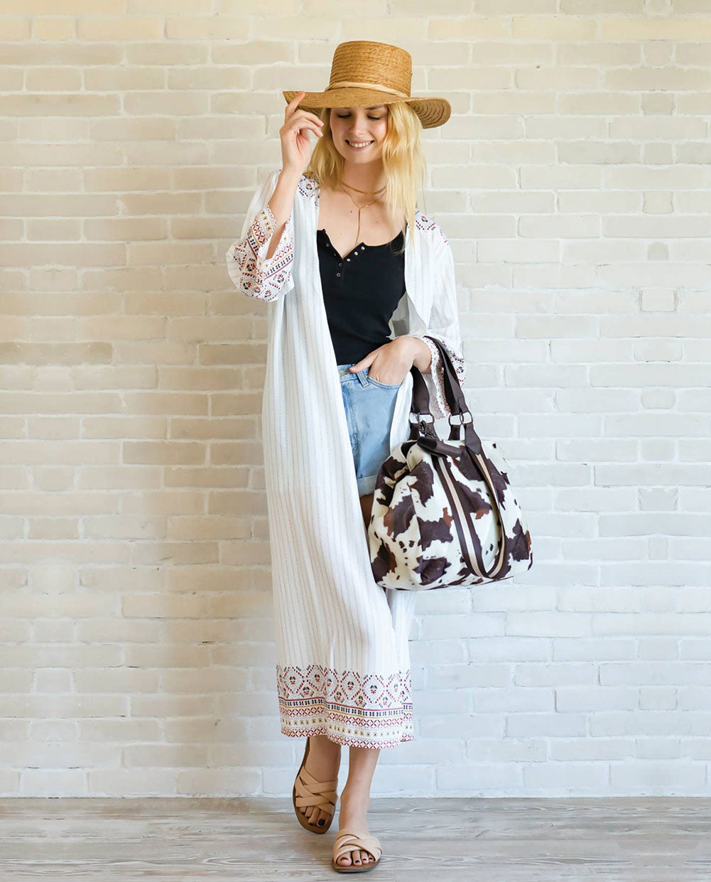 Alexandra Tribal Print Kimono adds effortless style to any outfit. Its lightweight woven fabric and eye-catching tribal print make it a versatile layering piece for both casual and beach wear.