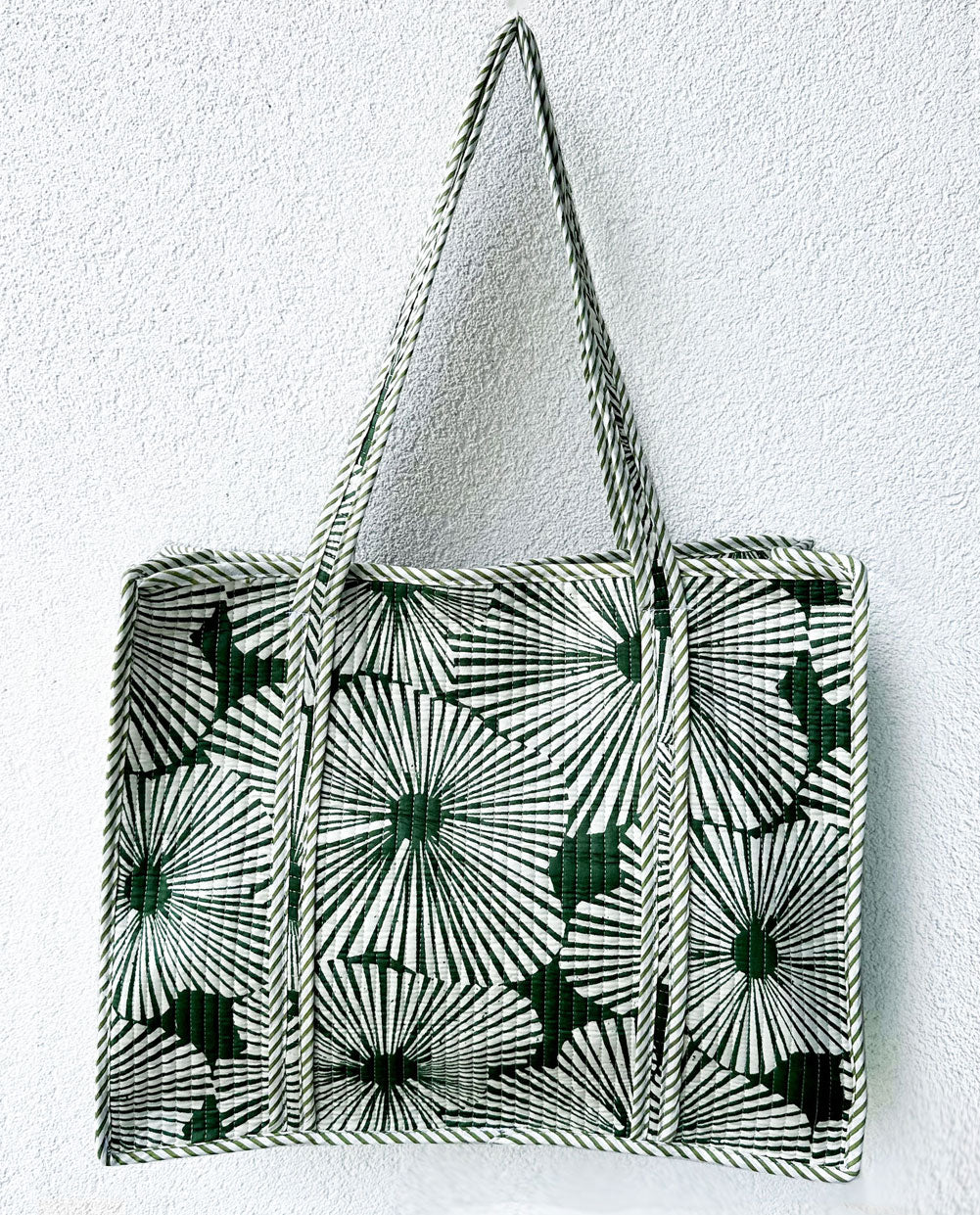 Traditional Kantha-style stitching gives the tote its elegant quilted surface while reinforcing the structure so it keeps its shape beautifully — even when full. Please note due to the handprinted nature of our fabric there may be very minor ink marks in the fabric.